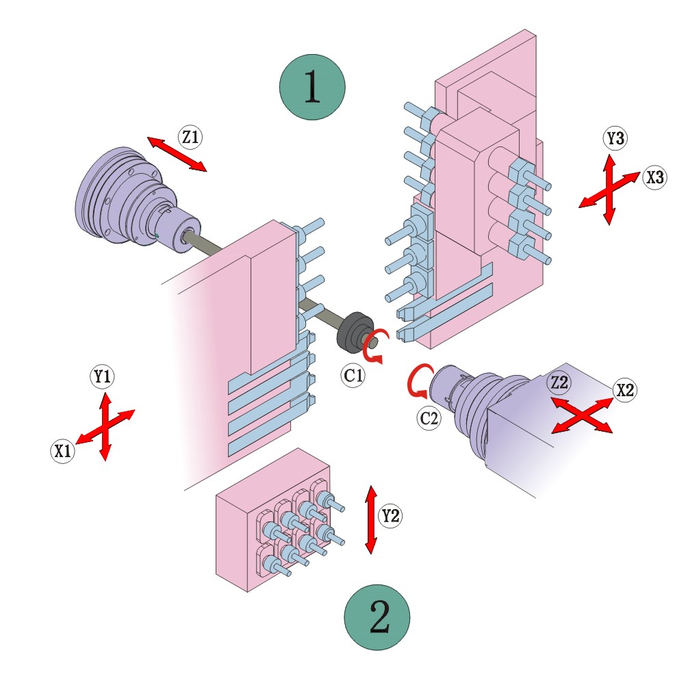 8、三通道控制方式,主轴端双X、双Y轴控制两把刀具同时与工件接触,可实现两侧同时 铣面、车削、打孔工艺,大大节省了加工效率。